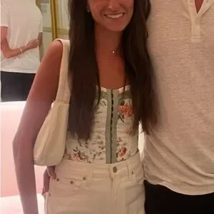 Elegant floral corset top. Features red roses and green lace trim. Perfect for a chic look.