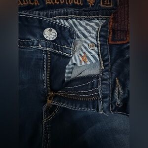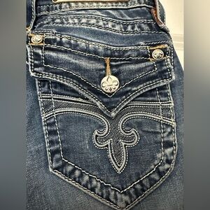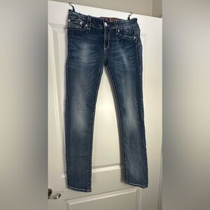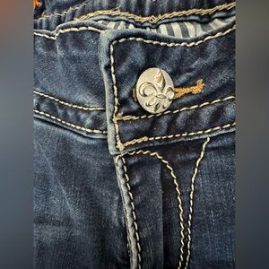 Skinny in a dark wash with hand-sanding and whiskering. Front and back are detailed with reversed Fleur de Lis and contrast trimming.