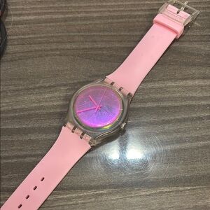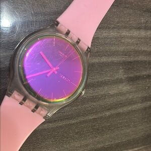 Chic Swatch watch with a pink band. Features an iridescent purple dial.