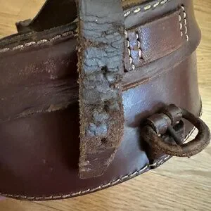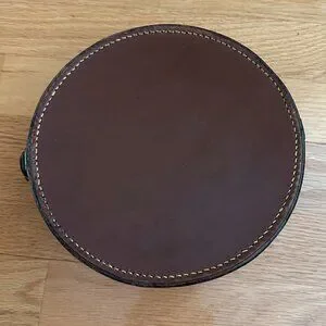 Antique Collar's Box. A brown leather cylindrical case with a strap and buckle. It has white thread stitching around the rim and upper edge of the lid, Leather strap over the top of the box that has a buckle closure. Interior is lined in a golden tan leather or leather like material. Initials A F S on the interior lid. Excellent antique condition. Some creases and scuffs in the exterior leather and buckle strap. A few dents and creases in the lid. Interior is very clean with no noticeable flaws. Could be used for display, a storage case or even a purse.
