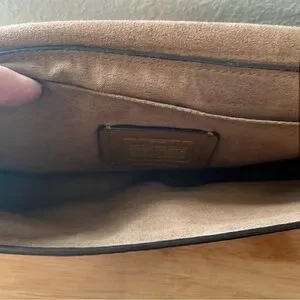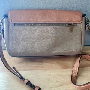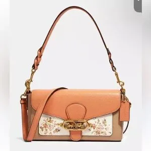 This Coach crossbody bag combines a sophisticated tan and cream color palette with elegant floral accents. Its structured design and adjustable shoulder strap make it a versatile accessory for any occasion.