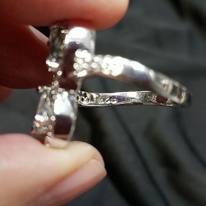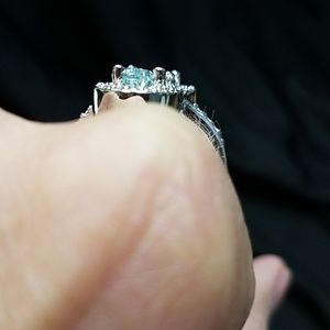 This stunning twin pear cut moissanite is in an ice blue color with lots of fire and sparkle. Guaranteed to get attention. Each stone is around .75 carats each. This beauty is a true moissanite that will test positive for diamond. If someone can not tell you that about a moissanite, be skeptical. This show stopper is sterling silver in a size 7 accented with diamond simulants.