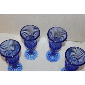 Add a touch of American heritage to your glassware collection with this stunning set of 4 vintage Fostoria cobalt blue glasses, originally made for Avon. These pressed glass goblets feature a brilliant cobalt hue and a beautiful combination of patterns, including a diamond point lower half and vertical ribbing above. Each glass is adorned with an etched cameo-style medallion of either George Washington or Martha Washington.