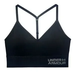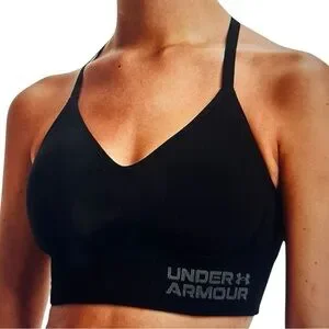 Crafted from a stretchy, athletic material, this Under Armour sports bra offers medium support with a sleek V-neck design and wide shoulder straps. The minimalist aesthetic and consistent black color make it a versatile choice for any workout. Experience the perfect blend of comfort and style with this essential piece of athletic wear.