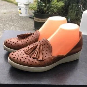 Fitflop Women Brown cut Leather Tassel Superskate D'orsay Latticed Leather Loafer Shoes Sz 41/9US. Stylish brown loafers featuring a classic tassel design. Perfect for casual and formal occasions.