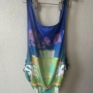 Stylish swimsuit with Miami graphic. Features vibrant colors and unique design.