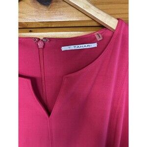 Elevate your wardrobe with this stunning Tahari pink midi dress. The sleeveless fit and flare knit dress is perfect for any casual occasion, and it will look great on anyone. The dress features a beautiful solid pattern and a flattering V-neckline. It also has a convenient zip closure and is made of a comfortable blend of polyester, viscose, and elastane.