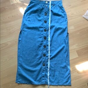 Chic maxi skirt (just above ankle) with pretty brown button front. High waist. Side slits for easy movement. 55% Linen, 45% rayon. Machine wash cold. In very good condition. From smoke free home.