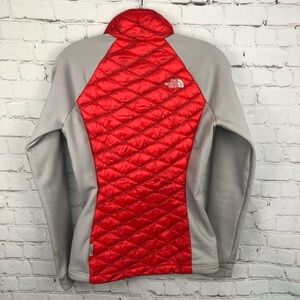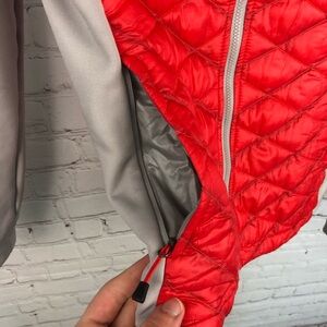 Experience the perfect blend of style and functionality with The North Face Puffer Jacket. This jacket features a vibrant red quilted front for insulated warmth and light gray sleeves for enhanced flexibility, making it ideal for active wear or layering. One small hole noted near hem.