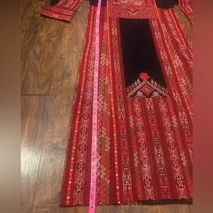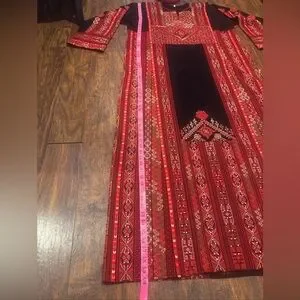 This stunning dress/thoub features a rich red color with luxurious gold embellishments, ideal for a wedding guest. The 3/4 sleeves and flowing silhouette offer a graceful touch, while the ornate neckline and intricate patterns add a sophisticated flair.