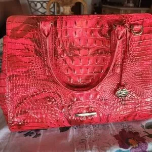 The Brahmin Red Satchel is a striking accessory, showcasing a vibrant red hue and a luxurious croc-embossed texture. Its structured design and metallic accents add a touch of sophistication, making it perfect for everyday elegance.