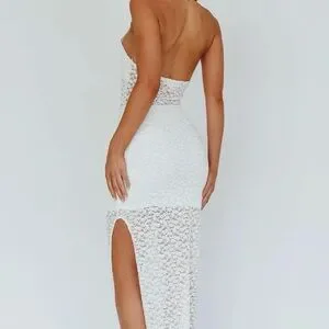 This white dress features a halter neckline and a dramatic side slit, perfect for a bride or cocktail event. The sleeveless design and maxi length create an elegant silhouette.