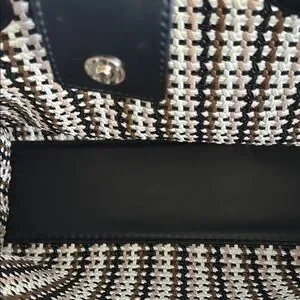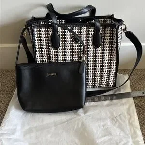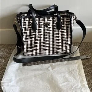 This Guess satchel showcases a striking black and white pattern, offering a bold geometric visual effect. The structured design is complemented by black trim and handles, making it a standout accessory for any occasion. Its medium size and classic shape ensure both style and practicality.