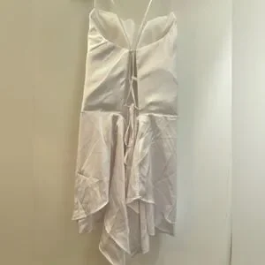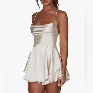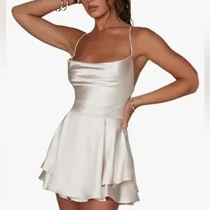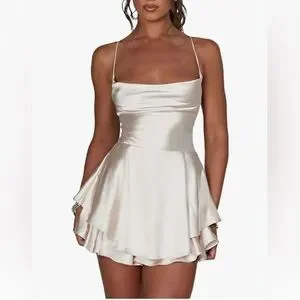 New Backless Short Satin Cowl Neck Ruffle Layer Spaghetti Strap Mini Dress