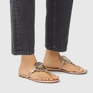 The go-anywhere Julia thong sandal features our prairie-inspired Tea Rose motif accented with our Signature hardware. The smooth leather flat is finished with a non-slip rubber sole for all day comfort.