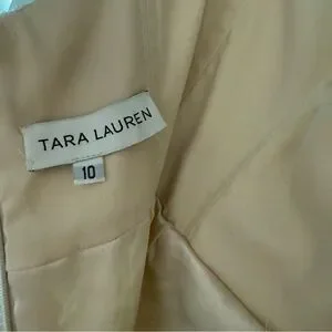 This Tara Lauren wedding dress from the Spring 2017 collection features a strapless neckline with lace detailing over satin material. The dress is in size 10, designed as a column/sheath silhouette with a train. It comes in a beautiful combination of white and beige, perfect for a beach wedding. The sleeveless style adds to the elegant and timeless look of this stunning gown.