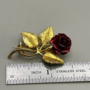 This exquisite brooch showcases a naturalistic leaf design in gold, accented with a deep red flower element. Crafted with attention to detail, it captures the organic beauty of real leaves, making it a perfect accessory for any occasion.