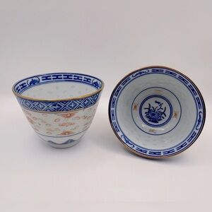 Enhance your dining, tea service, sake set up, or fine blue & white decor experience with this elegant porcelain “rice eyes” set. Featuring intricate blue and gold designs, these coordinating pieces add a touch of sophistication to any table setting. Translucent “rice eyes” pattern is captivating! This set includes 2 small, handle-less cups for tea or sake, and 1 saucer. In excellent preowned and preloved condition, the collector had these carefully displayed and stored in casing for many years. No chips/ cracks/ fading.