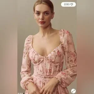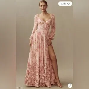 Elegant pink maxi dress with floral pattern. Features long sleeves and a flowing skirt. Perfect for special occasions.