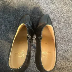 This is an authentic pair of CHRISTIAN LOUBOUTIN Patent Leather Moulage 140 Booties 36.5. The unique style and exceptional quality of these Christian Louboutin platform heels lend a sophisticated chic look for evening. These have a heel and one inch platform. They have a mule type shoe of patent leather with a rounded toe and an inside zipper. Worn only once with dustbag and box included.