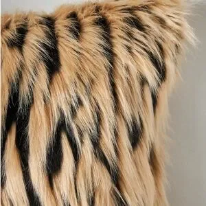 Luxurious faux fur pillow. Features bold tan and black pattern. Perfect for adding texture and style.
