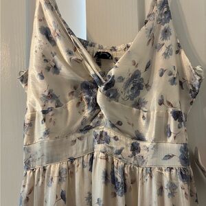 Chic ARULA dress with a floral design. Features a blend of white and blue hues. Ideal for stylish outings.