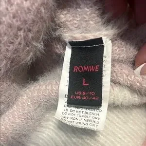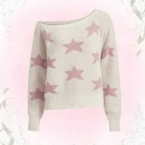 Soft and cozy fuzzy knit sweater from ROMWE, featuring a charming pink star pattern on a cream background. This long sleeve pullover has a slightly cropped fit, perfect for layering in cooler weather. Size Large (US 8/10), gently worn with no flaws.
