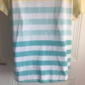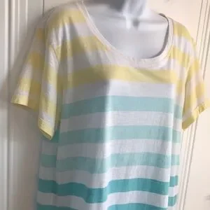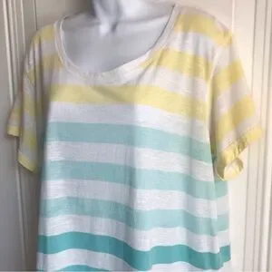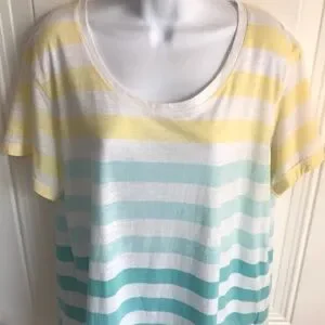 Women’s ANA JCP Brand Yellow Teal Green Blue & White Stripe Short Sleeve Lightweight Relaxed Fit Cotton Blend Tee Top in size XL. Showing some signs of normal wear, priced accordingly.