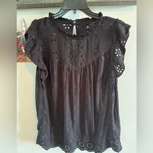Chic black blouse with eyelet lace. Features ruffled sleeves. Perfect for versatile styling.
