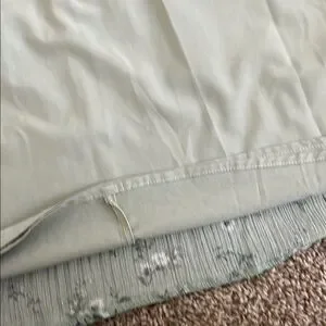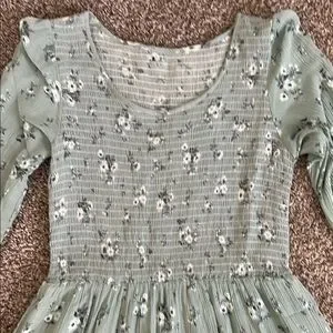 Charming green dress with floral pattern. Features long sleeves and a tiered skirt.