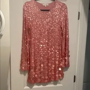 This stunning sheath dress by LoveShackFancy features a dazzling array of gold and pink sequins, perfect for a cocktail night out. The long sleeves and crew neck add a touch of elegance, while the embellished design ensures you stand out in any formal setting.