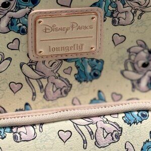 Adorable and rare Disney Parks Loungefly mini backpack featuring Stitch and Angel in a pastel heart print. Light blush-pink trim and rose gold zippers and hardware. Adjustable straps, side slip pockets, and interior with pink floral lining. A collector’s favorite and park exclusive!