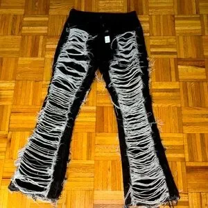 Chic black bootcut jeans with shredded accents. Ideal for a modern style. ANY QUESTIONS FEEL FREE TO ASK BEFORE PURCHASING.