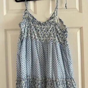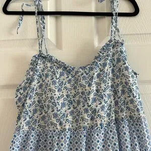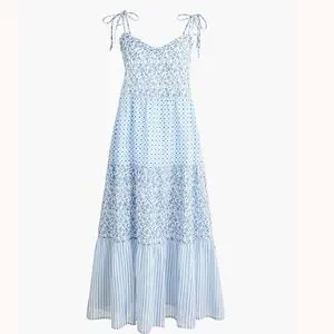 Charming light blue maxi dress with floral and stripe patterns. Features adjustable shoulder ties. Perfect for casual outings.