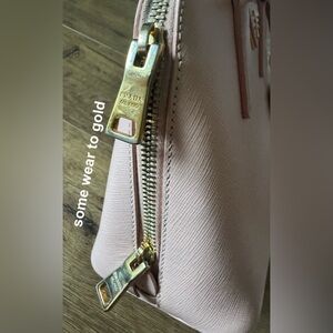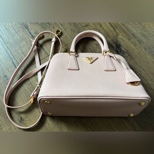 PRADA-AUTHENTIC (Preowned)Pink Saffiano Leather Crossbody Handbag! Purchased on Poshmark (Authenticated by Poshmark), two handles, detachable strap, gold hardware, "Prada" plaque on front and in the interior, bottom studs, attached clochette. In GREAT CONDITION (some visible wear to gold zipper pulls, no stains or scuff. PLEASE look at ALL PHOTOS and ask questions, if needed). Measures-10L x 7H x 4D