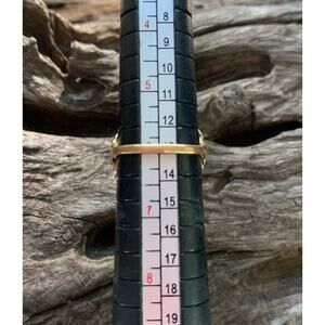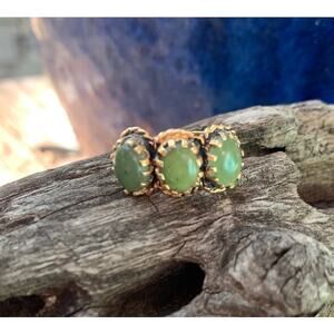Beautiful 14k gold and nephrite jade 3 stone ring, vintage and a size 6. Three oval shaped nephrite jade stones set in 14k gold, prongs all way around stones with roping around bottom. Ring measures .40 inches wide. Cant read markings but did test 14k gold. Size 6