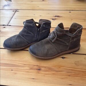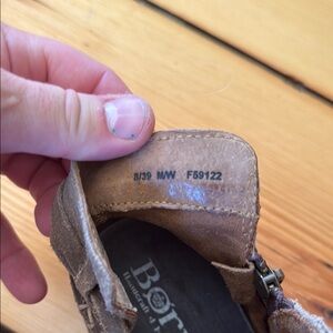 Born Tarkiln distressed supple leather side zip ankle booties with leather straps. These are great for mountain casual, boho, or skandi outfits! I wore them for a Viking themed wedding even!