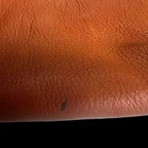 This bag is in decent used condition. There is an ink spot on the leather and small tear in the denim (see pictures). The gold buckle has some scratching. The inside shows some dirty but not major stains.