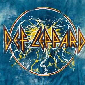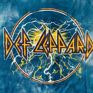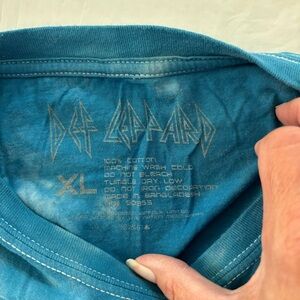 See Photos. See Measurements. Vibrant blue tie-dye t-shirt featuring a bold Def Leppard graphic. B203