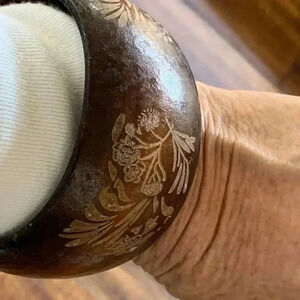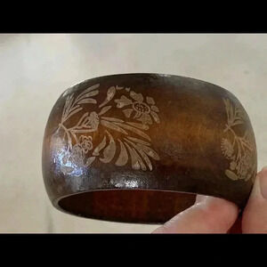 2 inch wide wood bracelet measuring 2.7 inches inside diameter across. Picked up at an estate sale.