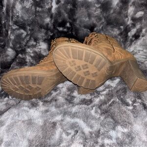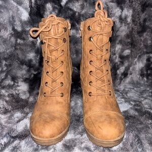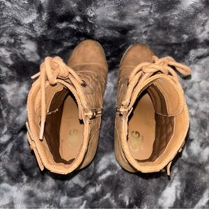 G by Guess ankle booties, featuring a chic quilted tan design and a fashionable chunky heel. The combat-style lace-up closure and decorative side buckle add a touch of rugged elegance, making them perfect for both casual and dressy occasions. Extremely comfortable. Worn once. Excellent condition.