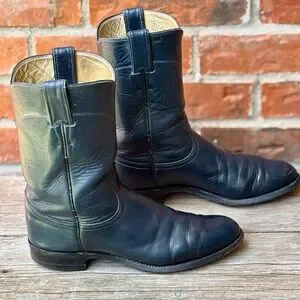 Nice pair of Justin 3024 Roper or work boots size 8B. Upper in overall good pre-owned condition with some scuffing on toes, normal wear on bottom sole. From smoke free environment. Thanks for looking!