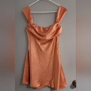 Chic orange satin dress with a sleek design. Ideal for stylish outings.