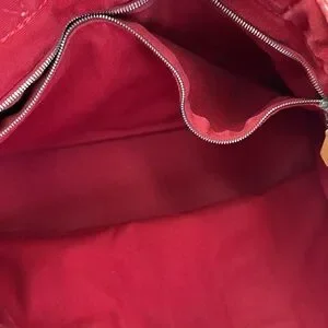 Hermes unisex heavy canvas tote in rare red. Doubled canvas with 6 outer pockets and one interior zip pocket. Snaps closed at center top and upper sides. Holds a laptop and more. Reinforced bottom. One corner shows minor wear to outer layer of canvas. Great everyday tote by Hermes. Cleaned