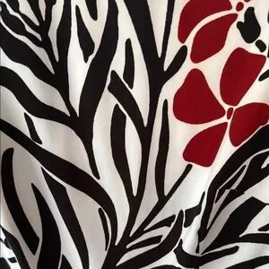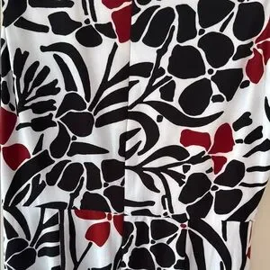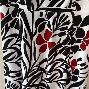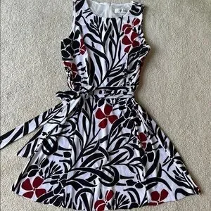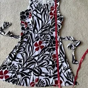 Elegant sleeveless dress featuring a striking floral pattern. Perfect for any occasion with its bold black, white, and maroon design. You can wear it with or w/o the belt, the hem has been cut to a shorter length.