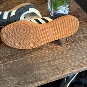 Stylish Adidas Samba trainers with black suede and white accents. Features signature three stripes and durable gum sole.