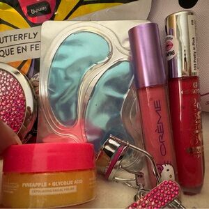 Charming Hello Kitty beauty set. Features lip gloss, body butter, face, eye, and lip masks, lip liner, compact mirror, tweezers, etc. Features Crème Shop, Coulor Pop, Maybelline, etc. all items are new, non smoking.