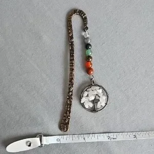 Elegant metal bookmark with floral engravings. Features colorful gemstone beads and a tree pendant.