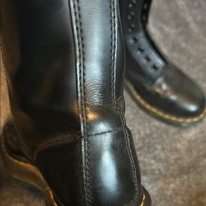 Experience timeless style with these Dr. Martens black combat boots. Featuring a high ankle design and a smooth polished leather finish, these boots are both durable and fashionable. The iconic chunky sole and visible stitching add a distinctive touch to any outfit.