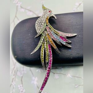 Silver Tone Rhinestone Art Deco Multicolor Peacock Bird Brooch Pin